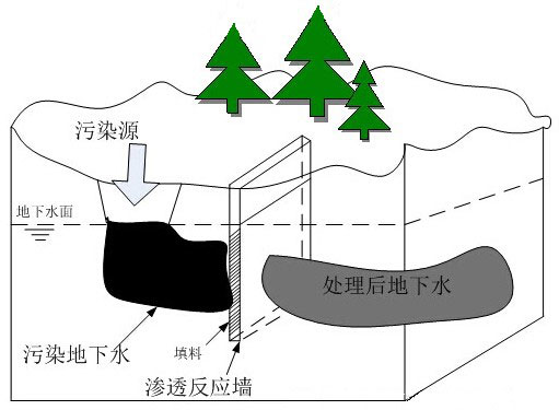 滲透性反應墻技術是一種原位修復技術,是指在地下水污染源的下游開挖溝槽,安置連續或非連續的滲透性反應墻,在其中充填反應介質,與流經的地下水發生物理、化學和生物化學反應,使地下水中的污染物得以阻截、固定或降解。